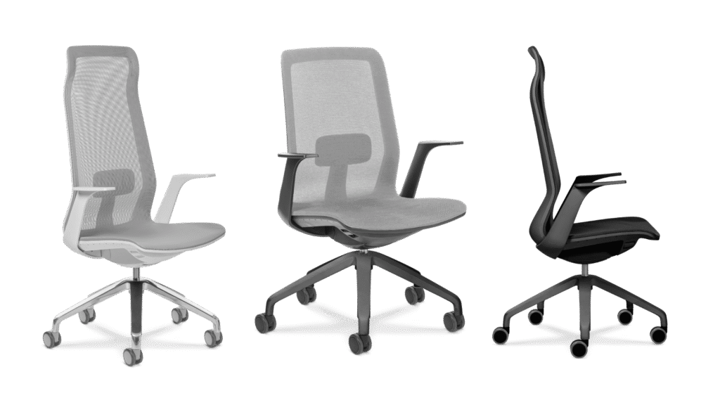 Ela oferece espaldar alto ou médio, regulação de altura e apoio lombar ajustável. É uma excelente cadeira para escritório para equipes de criação, coworkings e espaços colaborativos, onde o foco é a fluidez do ambiente.